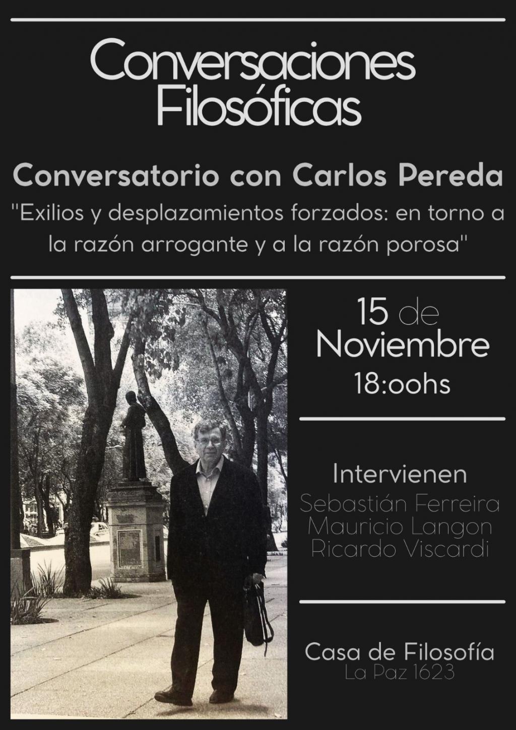 El Ciclo Conversaciones Filosóficas fue iniciado precisamente por una intervención de Carlos Pereda, en ocasión de una visita a su país natal. En esta oportunidad el académico compatriota que vive en México intercambiará en formato conversatorio, sobre algunos pasajes de su obra, como la problemática de los exilios y las migraciones forzosas, su crítica al régimen social de la razón arrogante como puede observarse en los vicios coloniales del "fervor sucursalero" o el "afán de novedades", así como su propuesta en torno a la razón porosa.